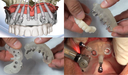Zusätzlich kann auf Basis der 3D-Planung eine Implantationsschablone hergestellt werden. Sie dient beim späteren Einfügen der Implantate in den Kiefer als Führung für den Bohrer und gibt die genaue Position der Implantate für den Eingriff genau vor. Daher spricht man von „navigierter Implantation“.